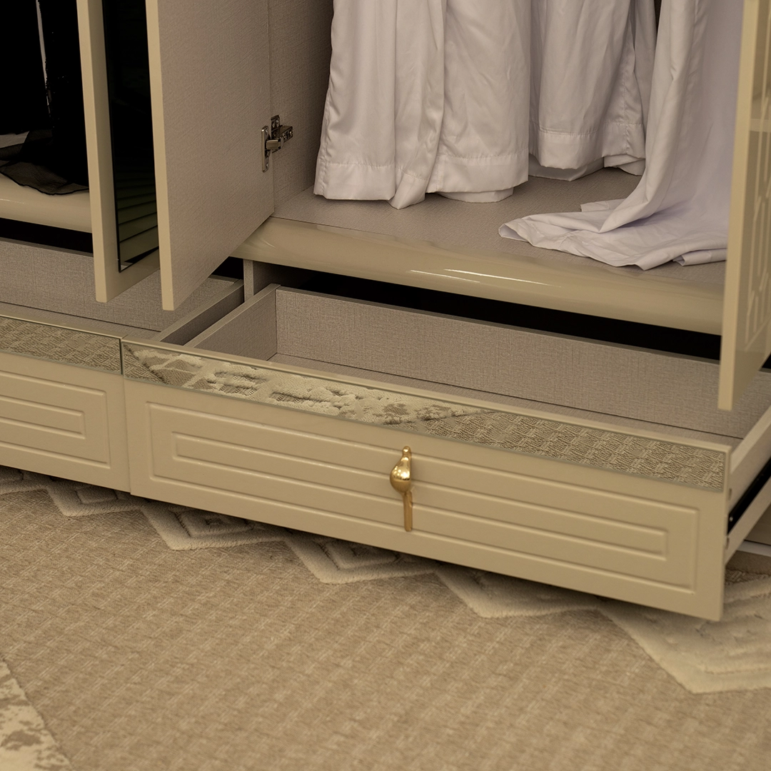 | Set Includes: | 1 Bed, 2 Nightstand, 1 Bed bench, 1 Chest of drawers, 1 Dresser, 1 Dresser stool, 1 Wardrobe |